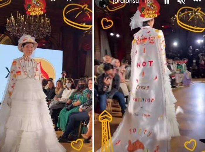 Bisa dipahami kalau hal ini menimbulkan kelucuan sekaligus gagal paham, sebab apa urusannya ayam geprek ikut membuat ‘pedas’ perhelatan busana dunia itu.