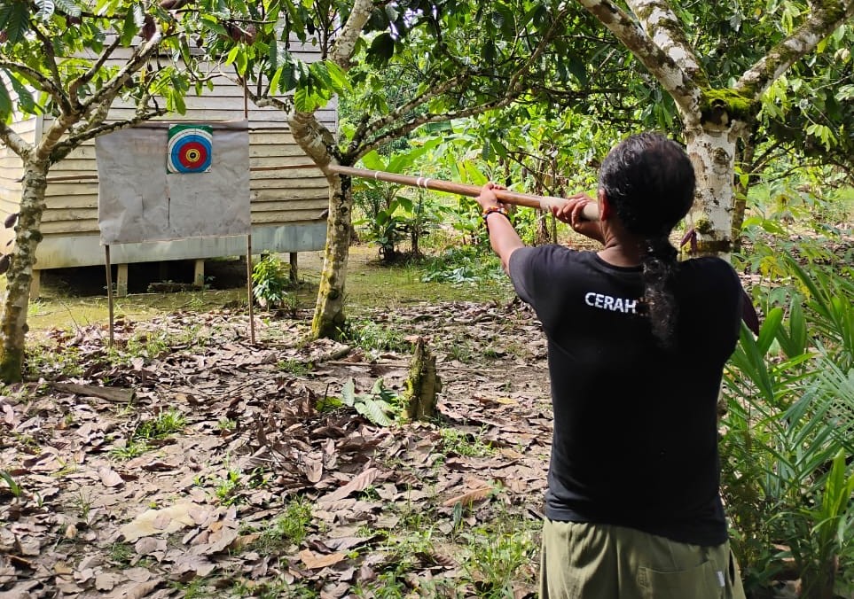 Ketika hujan reda kamipun pergi ke lapangan depan lamin adat. Dan disana telah ada beberapa orang berjajar meniup sumpit. Jarak antara tempat berdiri hingga sasaran kurang lebih 20 meter. Saya makin keder untuk mencoba turut meniup sumpit.