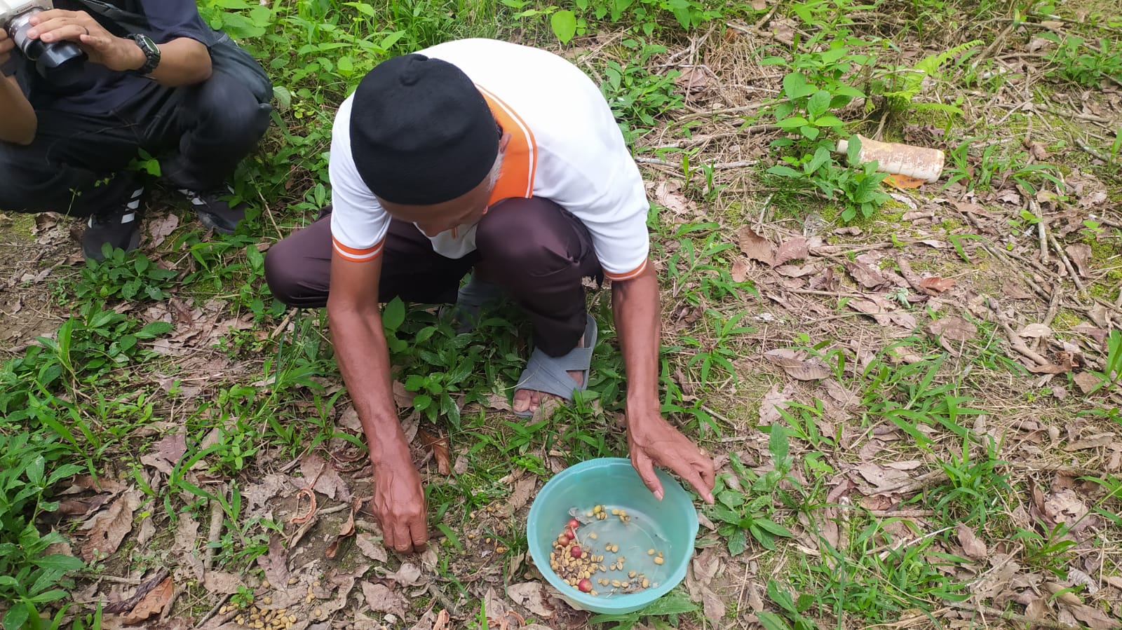 Pak Supardi anggota kelompok tani Kapak Prabu tengah mengumpulkan biji kopi yang dikeluarkan oleh Luwak dalam bentuk feses. Namun karena hujan semalam, biji kopinya bukan lagi berupa gumpalan.